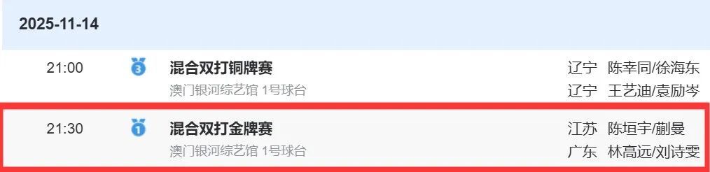 21:30(1号桌)混合双打决赛 林高远/刘诗雯(广东队)VS陈垣宇/蒯曼(江苏挺拔队)