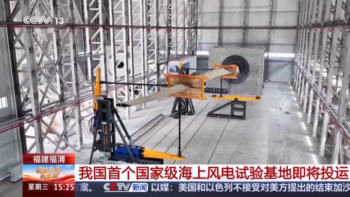 总台记者黄珊:海上风电试验基地包括陆上检测中心和试验风电场两部分,陆上检测中心坐落于福清市的江阴产业园内,靠近江阴港码头,旁边是福建最大的风电产业园。整个陆上检测中心包含了叶片试验平台和传动链测试平台。